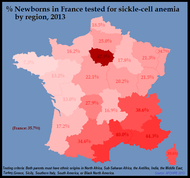 The original study appeared in the “ultra-right wing” Journal of Clinical Pathology around 2012 and was analyzed in an article by Falko Baumgartner entitled “The Africanization of France,” a little later. Basically, newborn babies of people of Middle East and sub-Saharan African origin are tested for sickle-cell disorder in France and the percentage of newborns subject to such testing is surprisingly high and rising. While I’m slightly skeptical of the most recent figures showing high levels of testing, it’s certainly consistent with the population one sees on the streets in France.